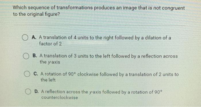 Solved Which Transformation Or Sequence Of Transformations Would Produce An Image Hat Is Not Congruent To Its Pre Image Arotation Of 180 Degrees About The Origin A Dilation Followed By Reflection A Translation Of